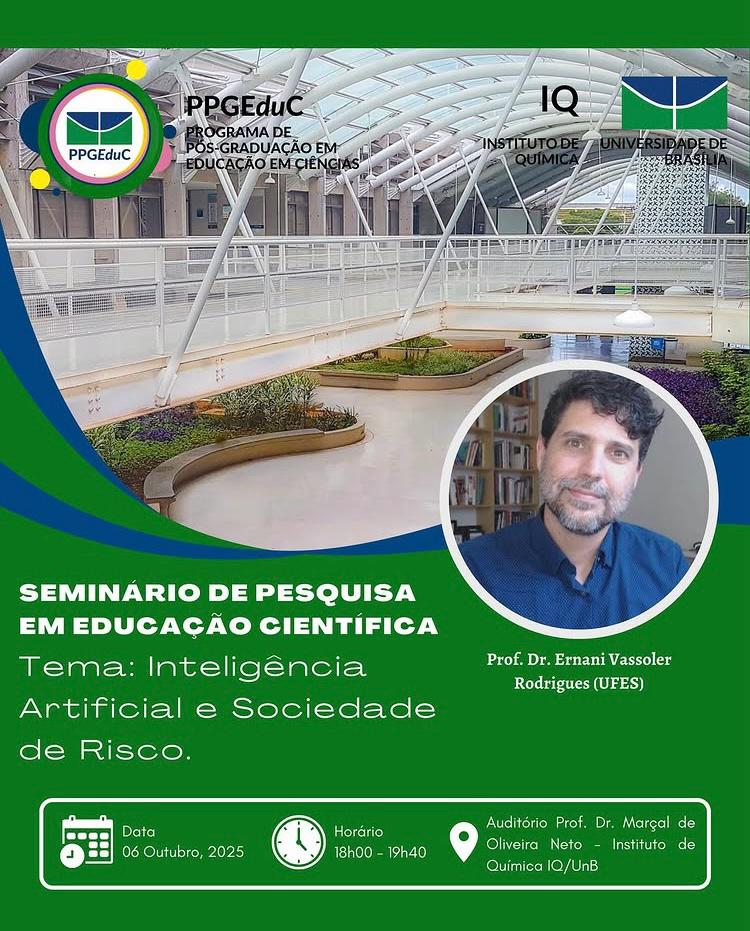 O Programa de Pós-graduação em Educação em Ciências (PPGEduC/UnB), por meio da disciplina Seminário de Pesquisa em Educação Científica, convida todas(os) para o seminário: Inteligência Artificial e Sociedade de Risco, ministrado pelo Prof. Dr. Ernani Vassoler Rodrigues (UFES). 🗓 Data: 06 de outubro de 2025 ⏰ Horário: 18h00 às 19h40 📍 Local: Auditório Prof. Dr. Marçal de Oliveira Neto – Instituto de Química IQ/UnB