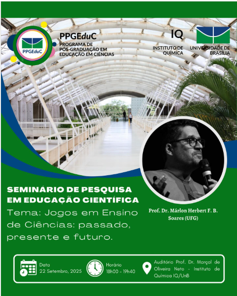 O Programa de Pós-graduação em Educação em Ciências (PPGEduC/UnB), por meio da disciplina Seminário de Pesquisa em Educação Científica, convida todas(os) (ao clicar no link do título, o usuário será direcionado para uma página que contém o texto abaixo: Seminário de Pesquisa em Educação Científica: Jogos em Ensino de Ciências: passado, presente e futuro, ministrado pelo Prof. Dr. Márlon Herbert F. B. Soares (UFG). O Programa de Pós-graduação em Educação em Ciências (PPGEduC/UnB), por meio da disciplina Seminário de Pesquisa em Educação Científica, convida todas(os) para o seminário: Jogos em Ensino de Ciências: passado, presente e futuro, ministrado pelo Prof. Dr. Márlon Herbert F. B. Soares (UFG). 🗓 Data: 22 de setembro de 2025 ⏰ Horário: 18h00 às 19h40 📍 Local: Auditório Prof. Dr. Marçal de Oliveira Neto – Instituto de Química IQ/UnB