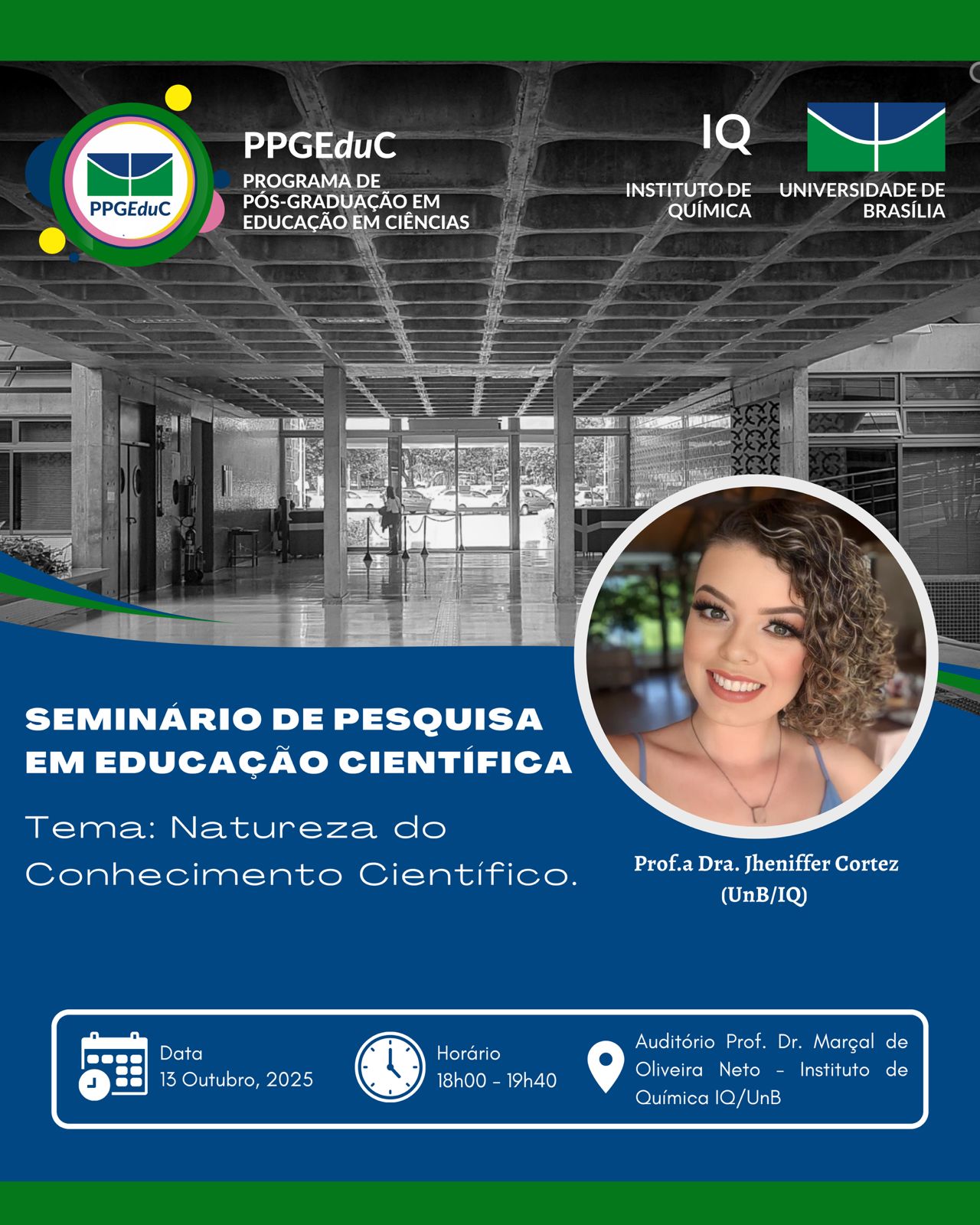 O Programa de Pós-graduação em Educação em Ciências (PPGEduC/UnB), por meio da disciplina Seminário de Pesquisa em Educação Científica, convida todas(os) para o seminário: Natureza do Conhecimento Científico, ministrado pela Profª. Drª. Jheniffer Cortez (UnB/IQ). 🗓 Data: 13 de outubro de 2025 ⏰ Horário: 18h00 às 19h40 📍 Local: Auditório Prof. Dr. Marçal de Oliveira Neto – Instituto de Química IQ/UnB